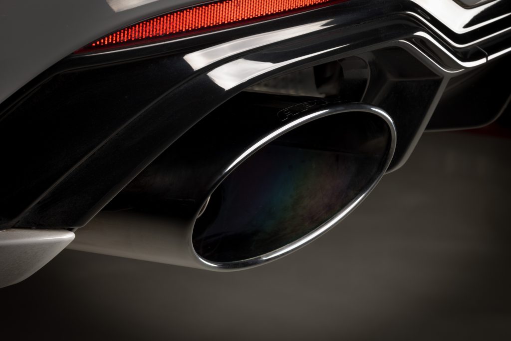 最終排氣經由雙鑄造 Y 接頭導入 四出 2.5 吋(63.5mm)尾段系統,搭配 7.25” x 5” RS 風格鑽石黑橢圓尾管,尾管上低調刻有 APR Logo,質感與性能兼具。